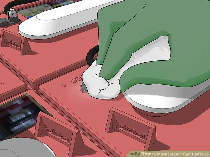 - If your cart runs on gas, you won’t see any fluid and don’t need to add any. Move on to cleaning off any corrosion you see, as described elsewhere in the article.
