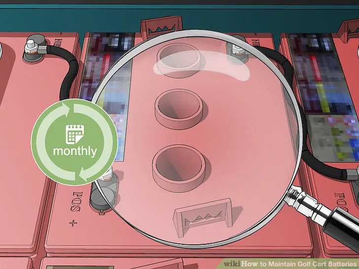 routinely. At least once a month, the batteries in an electric golf cart will need to be refilled with distilled water. You should also clean the terminals and take the time to inspect the components for damage. [7]