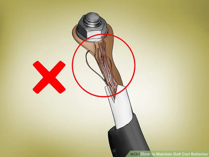 3 Replace any frayed cables immediately. Frayed cables are electrical hazards and should be dealt with before operating the cart again. Twist the nuts on the end clamps counterclockwise to remove them. Replace them with new battery cables purchased from an auto parts store. [9]